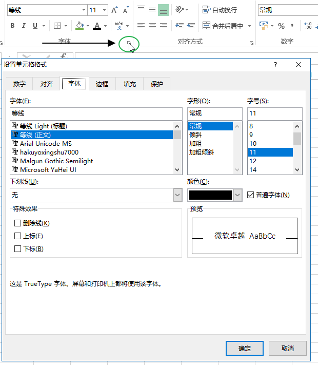 点击字体命令组右下角箭头可调出设置单元格格式菜单,进行更多设置。