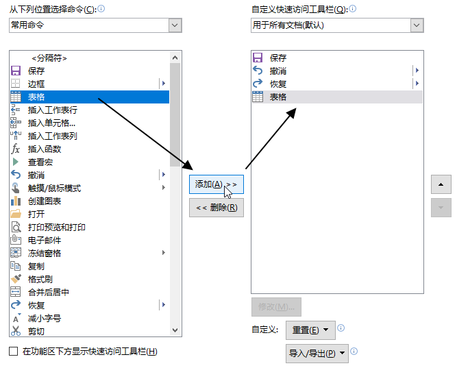 How to Customize Quick Access Toolbar 日期: 2026-03-02 09:15 栏目:excel教程 浏览: 选项位置 自定义快速访问工具栏 1.选择要添加的命令,点击中间”添加“命令按钮添加到快速访问工具栏。 2.调整命令顺序。点击右边上下箭头来调整命令顺序。 3.点击确认回到工作表,可以看到快速访问工具栏。 标签: 上一篇:Excel 自定义功能区设置教程 下一篇:How to Set Default Annotation 相关推荐 Excel快捷键选择从属单元格|高效操作技巧 Excel快捷键选择公式引用单元格|实用技巧全攻略 Excel显示定位菜单快捷键|实用技巧指南 Excel快捷键选择直接从属单元格|实用技巧