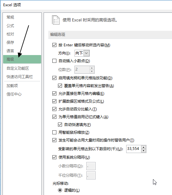 Excel高级设置所有选项列表 日期: 2026-03-03 09:15 栏目:excel教程 浏览: 高级设置选项位置 选项→高级 高级设置选项列表 1.编辑选项 2.剪切、复制和粘贴 3.图像大小和质量 4.打印 5.显示 6.当前工作簿的显示选项 7.当前工作表的显示选项 8.公式选项 9.计算当前工作簿时选项 10.常规选项 11.其他选项 标签: 上一篇:Excel公式计算选项设置指南 下一篇:Excel 公式引用样式设置教程 相关推荐 Excel快捷键选择从属单元格|高效操作技巧 Excel快捷键选择公式引用单元格|实用技巧全攻略 Excel显示定位菜单快捷键|实用技巧指南 Excel快捷键选择直接从属单元格|实用技巧