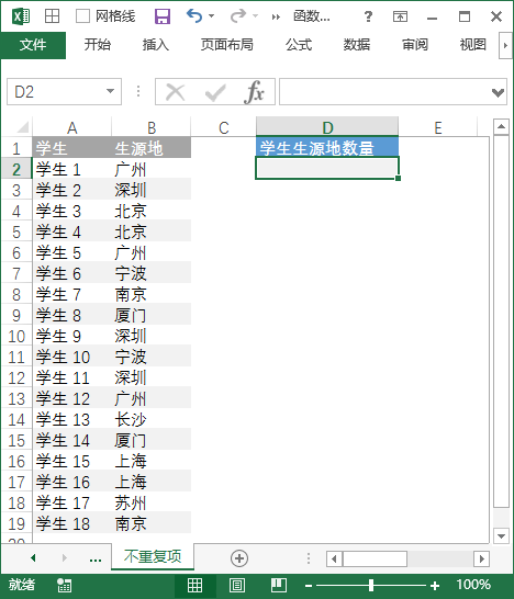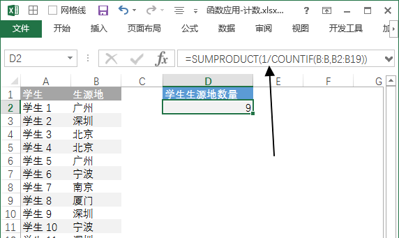 3.最后输入 COUNTIF 函数的参数,统计区域为生源地列,统计条件为所有的生源地。最后回车完成输入公式。