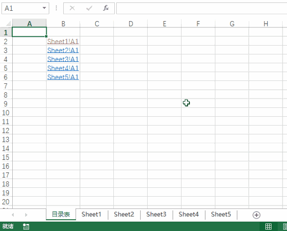 首先,组合你想要创建返回目录链接的所有工作表。然后在任意一工作表 A1 单元格输入返回目录表的 HYPERLINK 函数。公式如下: