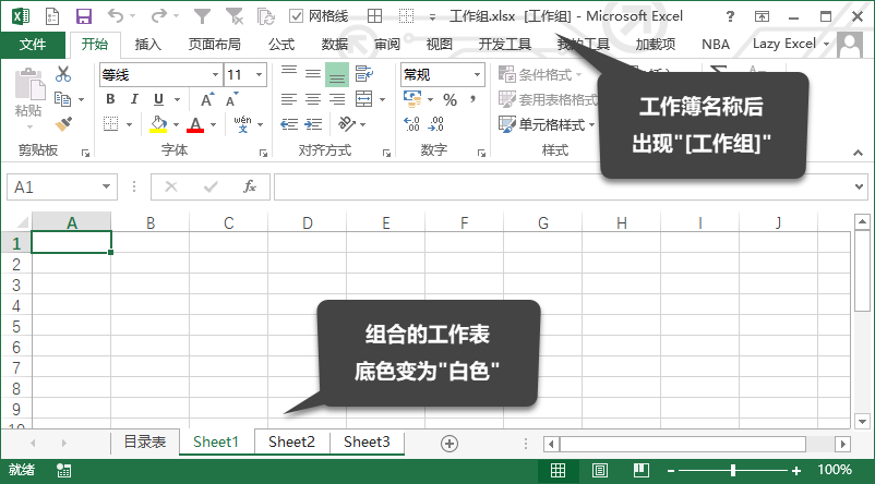 在工作表组合的状态下,其标签底色变为白色。此外,工作簿标题会出现 “[工作组]” 字样。