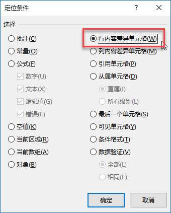 3. 其中,选择「行内容差异单元格」,点击确定;