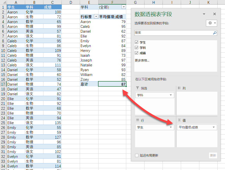 完成上一步后,我们就创建了一个数据透视表,此透视表的源数据就是我们要的一维数据。为了获取其一维源数据,双击行列总计的单元格。