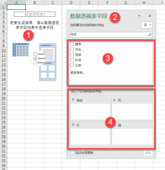- 透视表区域。数据透视表由筛选、列标签、行标签和值区域共 4 个部分组成。其中,筛选控制透视表的数据源的范围,列标签和行标签在水平和垂直方向展开数据,值区域统计数据。