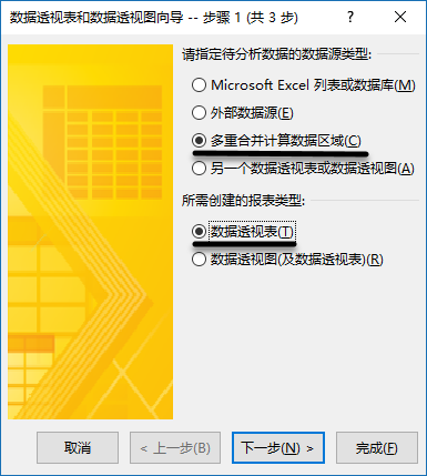 接上一步,根据向导提示,在步骤一中的数据源类型选择「多重合并计算数据区域」,报表类型选择「数据透视表」。