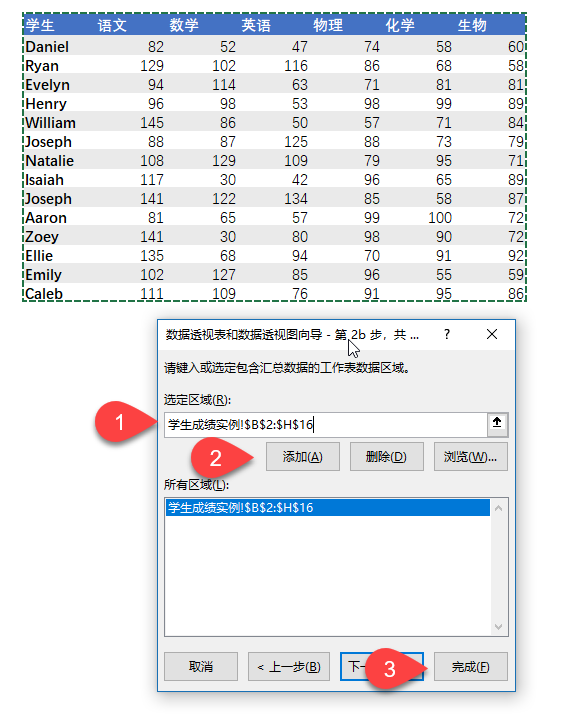 在步骤三,点击选定区域框,选择要转换的数据区域,然后点击下方「添加」按钮,将数据添加到所有区域。最后点击「完成」结束。