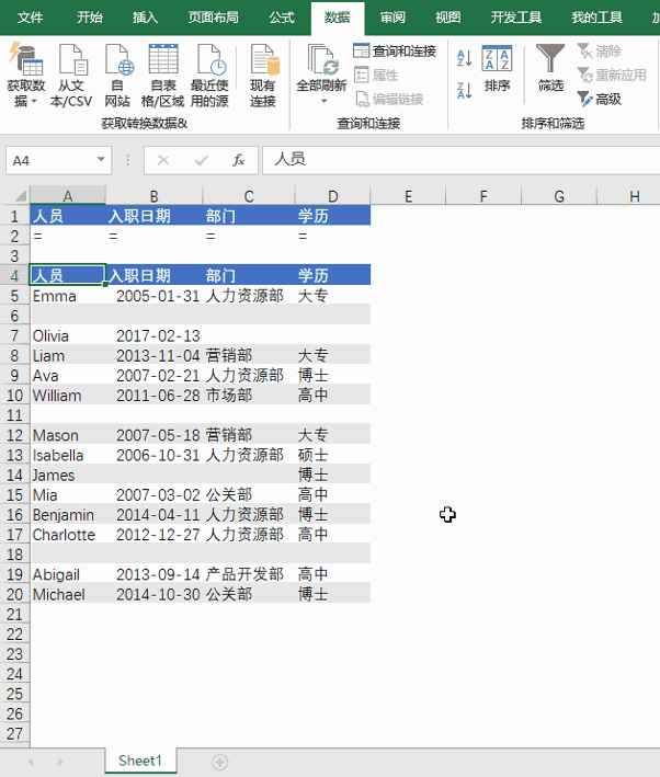 高级筛选功能要求,筛选标题和数据区域原标题必须保持一致。我们在数据区域上方插入行,将标题复制上去,如下图所示。