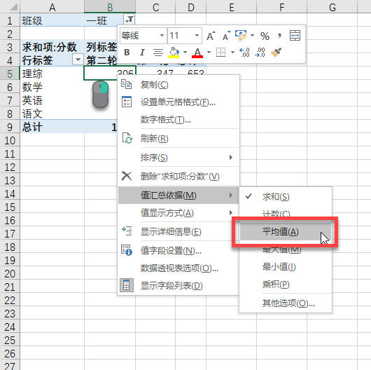 - 然后是值字段。在数据透视表区域,选中中间数据区域,鼠标右键,弹出菜单中选择「值汇总依据」,其中选择「平均值」。之后选中值区域的所有数据,调整有效位数到零位。