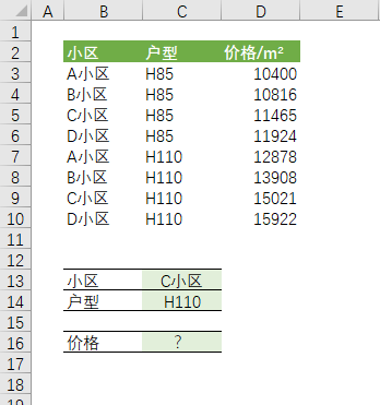 如下图,现有一二手房价格表,表中记录了不同小区和不同户型的房子的价格。现需要根据小区和户型,找到对应的价格。