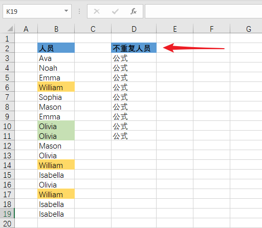 在D2单元格写入公式,向下复制,可以得到不重复数据。