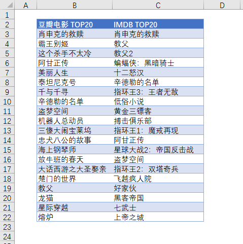 我们的示例数据如下,是豆瓣 TOP 20 和 IMDB TOP 20 电影的名称: