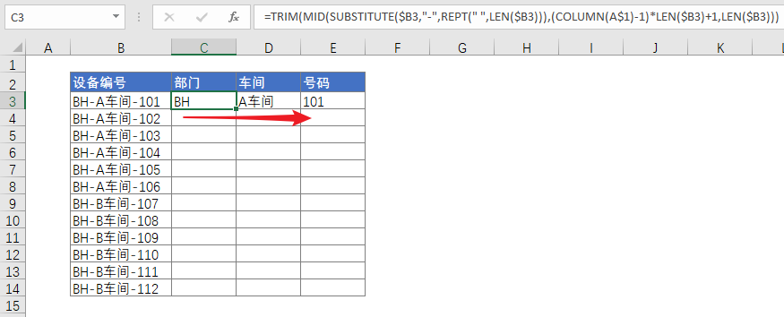 =TRIM(MID(SUBSTITUTE(分列单元格,"-",REPT(" ",LEN(分列单元格))),(COLUMN(A$1)-1)*LEN(分列单元格)+1,LEN(分列单元格)))