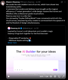 Deamoy 联合创始人 Shawn 在社交媒体上表示:“我们向这个时代的 Web 创造工具致敬,它们展示了两个演进方向:以 Lovable 和 Bolt.new 为代表的 AI 先驱,带来了「即时生成」的效率魔法;而以 framer 和Webflow 为代表的设计巨匠,则提供了专业级的可视化编辑器。Deamoy 的出现,正是为了将这两个方向的强大优势合二为一。我们创造了 AI 对话与可视化画布「双工编辑模式」,将 AI 的生成效率与专业级的创作控制权无缝连接,让每位创造者都能同时驾驭这两股强大的力量。”