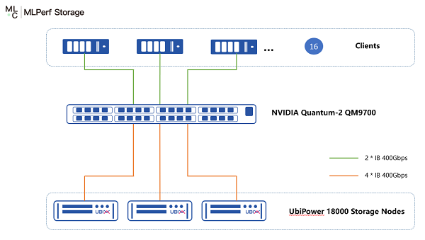 本次UbiPower 18000测试环境包含3节点组成的UbiPower 18000分布式集群(每节点配置了16块大普微Roealsen R6100 15.36TB NVMe SSD以及4张英伟达NVIDIA ConnectX-7 400Gbps IB网卡)、16台GPU算力服务器以及一台英伟达400G IB交换机,测试环境网络拓扑如下图所示: