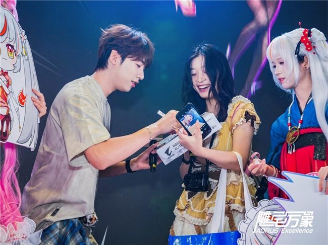 人气偶像空降展台,台上台下激情互动,硬核科技与娱乐盛宴完美融合。B站舞蹈区知名UP主青鸢Cyan、狼队《无畏契约》电竞选手留一手和小肥、前TEC.Blackovo、B站游戏博主中国Boy、音乐UP主YOUNG13DBABY、电竞游戏博主,技嘉AORUS星推官CSGO茄子、邪神Karasu空降展台,粉丝们热情高涨,欢呼声此起彼伏。偶像签名、合影,互动环节精彩纷呈,硬核科技与娱乐元素交相辉映,共同谱写电竞文化的璀璨乐章。全民狂欢也在此刻具象化,二次元文化的澎湃热血也在此刻完全迸发。