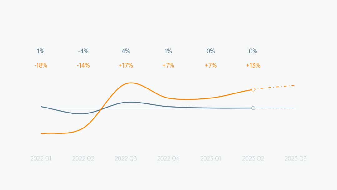 这份折线图并不复杂,数据对比的同时,末端用虚线表示,与常规的折线图略有不同: