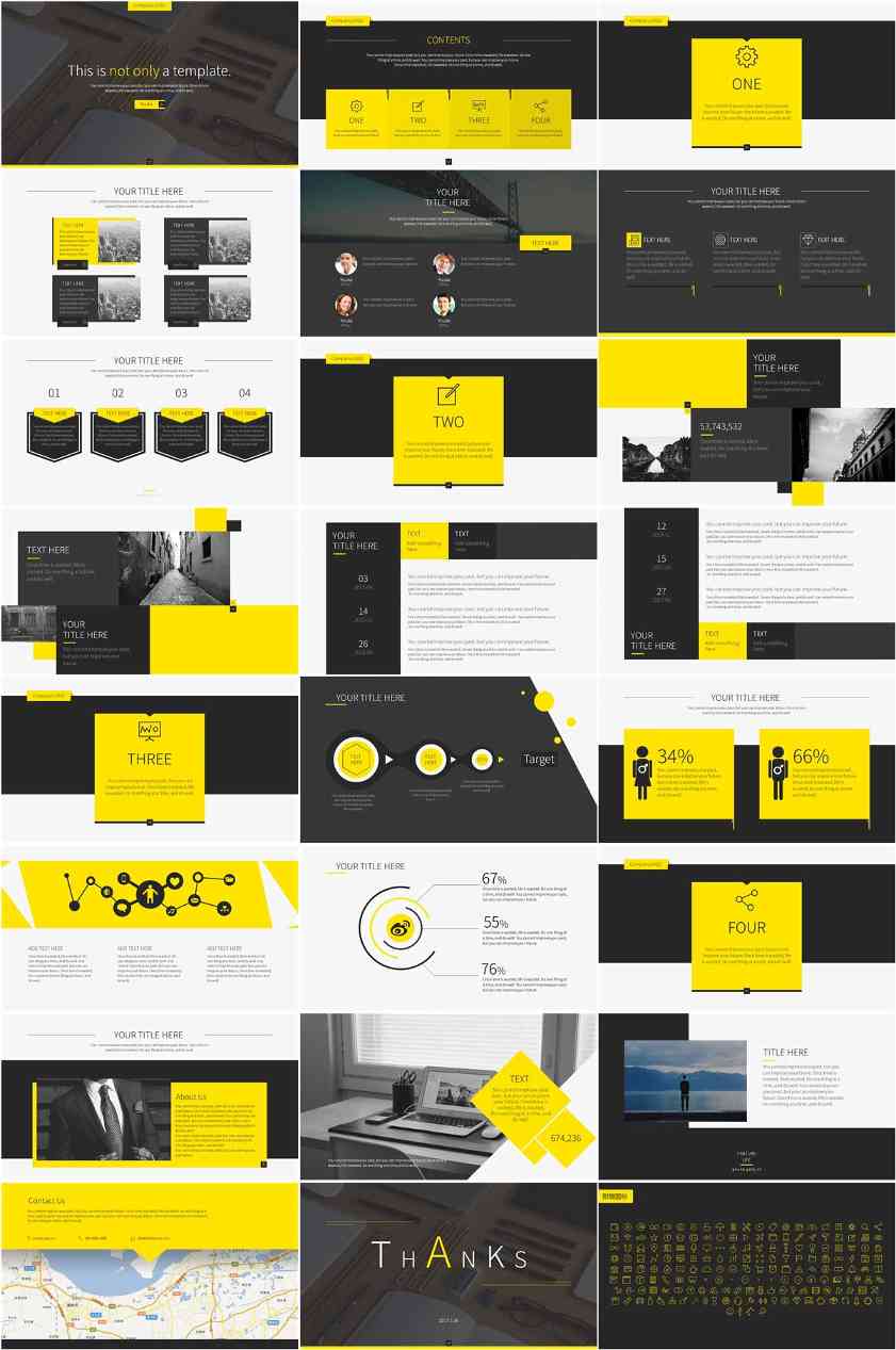 第三就是颜色。颜色不宜过多。这个PPT其实只有黄色这一种颜色。黑色和白色算消色,可以不算在颜色类别里。因此,看起来就很统一,有重点。所谓一眼就是那种:花了心思的PPT。