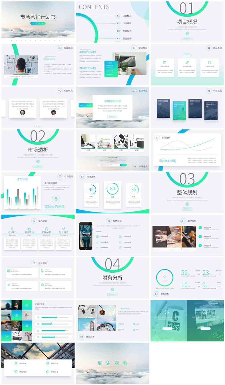 这是一个整体很简洁清新的PPT模板。我们在自己设计的时候也可以尝试一下这种设计思路。